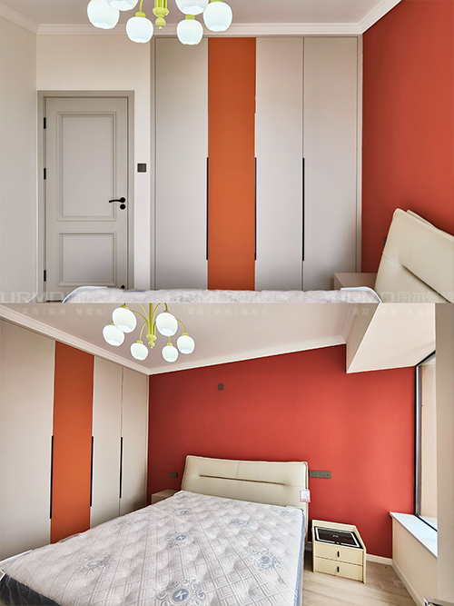 臥室朱紅色的背景搭配一門到頂跳色柜門,簡(jiǎn)直不要太美啦!