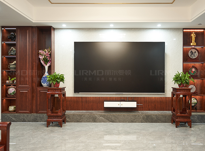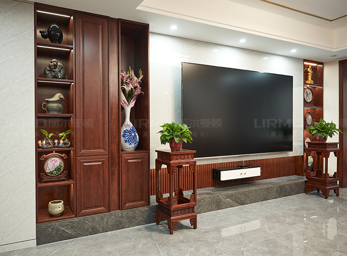 電視背景墻選擇大理石紋路木飾面,搭配開放格和格柵板,整體和諧統一又大氣。