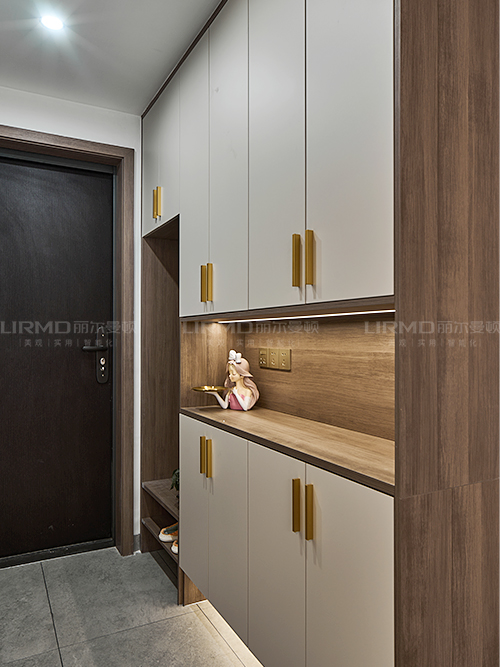 實(shí)木柜體搭配PET膚感柜門,收納更方便,左邊配有實(shí)木鞋架,鏤空處可