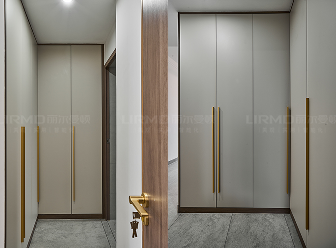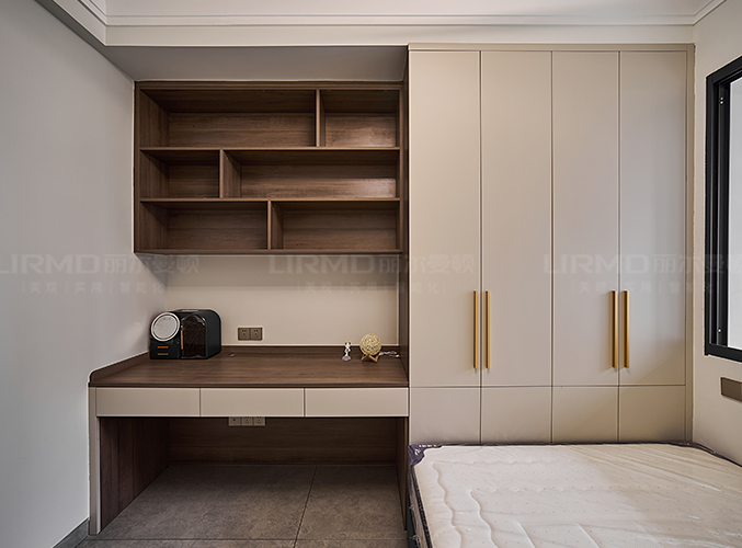 實(shí)木柜體搭配PET膚感柜門,衣柜+學(xué)習(xí)桌的組合,收納更加方便,走廊搭配一門到頂柜子,