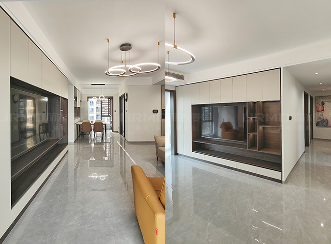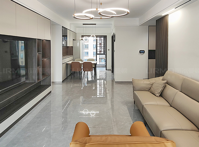 全屋通鋪瓷磚,視覺上看起來更顯大氣,電視背景墻采用整面墻做儲物柜設(shè)計,整體效果不顯沉悶,