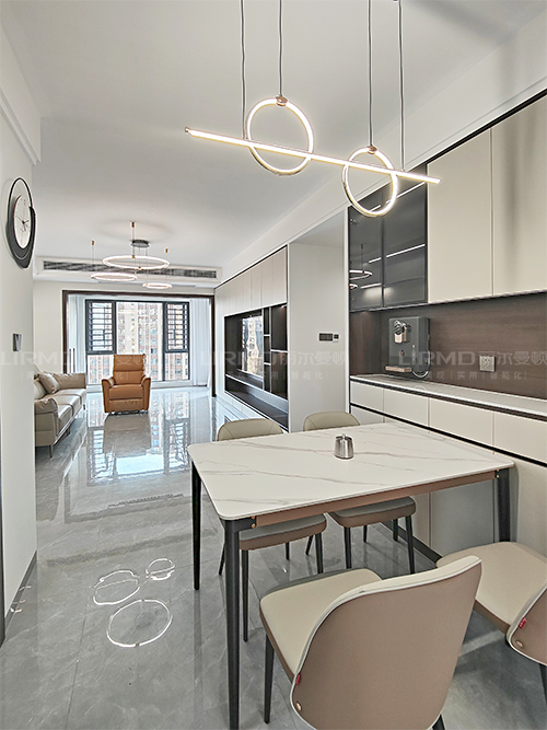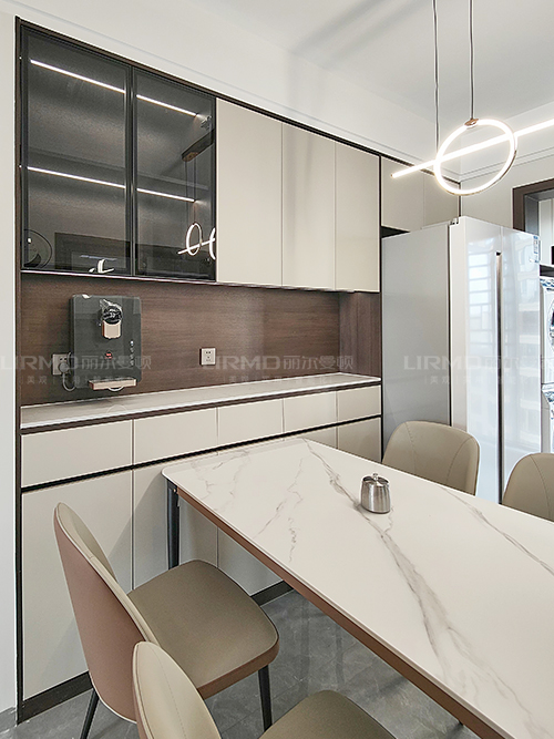 一整墻餐邊柜,中間臺面預(yù)留了插座,可放置一些小家電,其余柜子用來收納生活雜物,