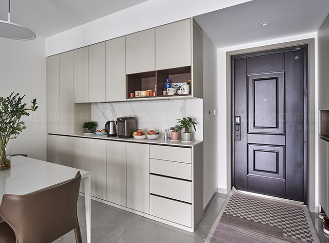 一整排的餐邊柜,中間部分可以做一個水吧臺的使用,背板和臺面均是巖板材質,更顯高級感。