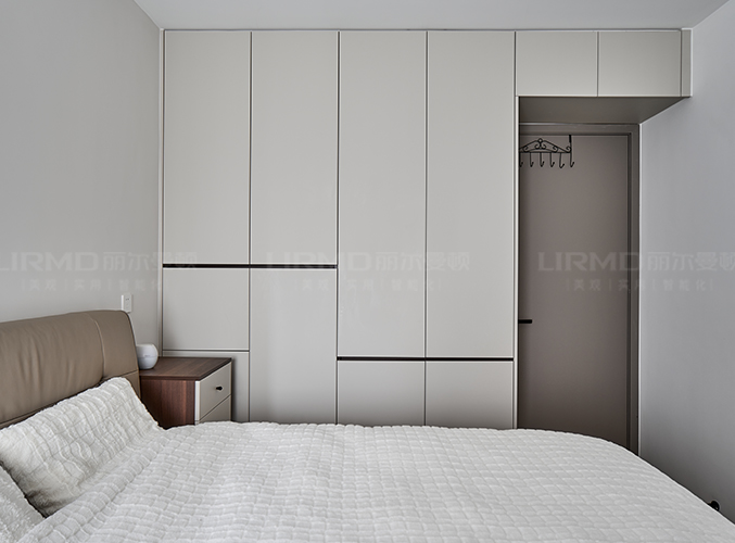 和墻面平齊,不占空間的同時收納更加方便,右邊通往小孩房的隱形門設計,