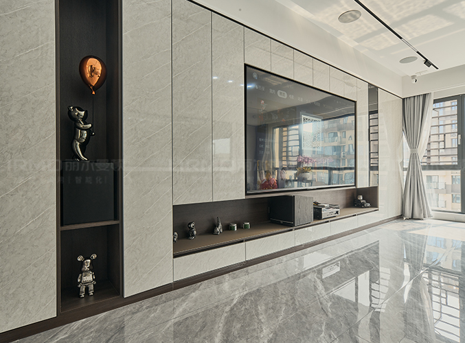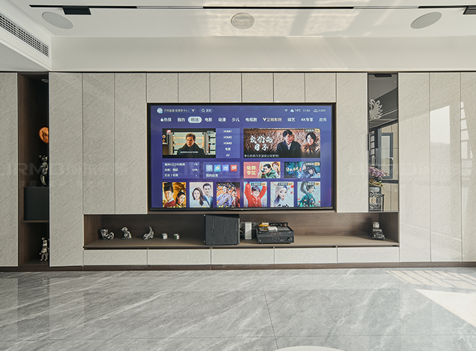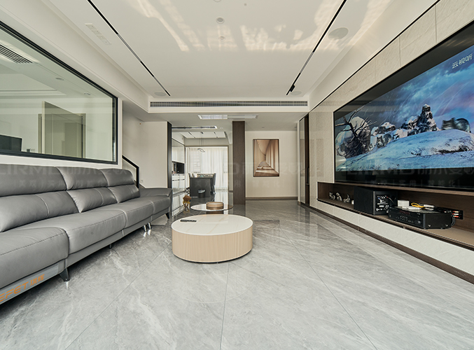 整屋通鋪瓷磚,盡顯大氣,電視背景做整面撞色收納柜,滿足視覺效果的同時,也能增加儲物空間。