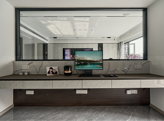 砸墻做半墻玻璃,書房客廳更加通透,超長書桌設計加正面書柜設計,學習辦公兩不誤。