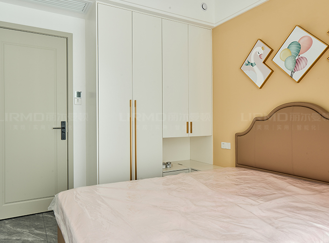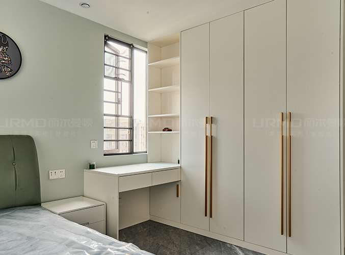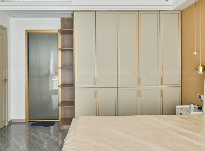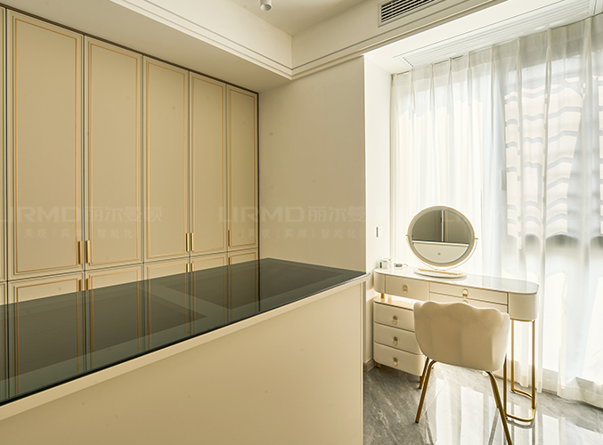 整面墻做衣柜,更加好分類,柜子象牙灰色鑲嵌金屬邊框,側邊做一個圓弧角處理,
