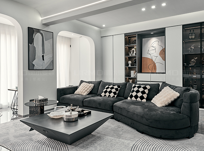 沙發背后一整墻的柜子設計,方便收納,右側玻璃展示柜柜門的設計更具設計感。