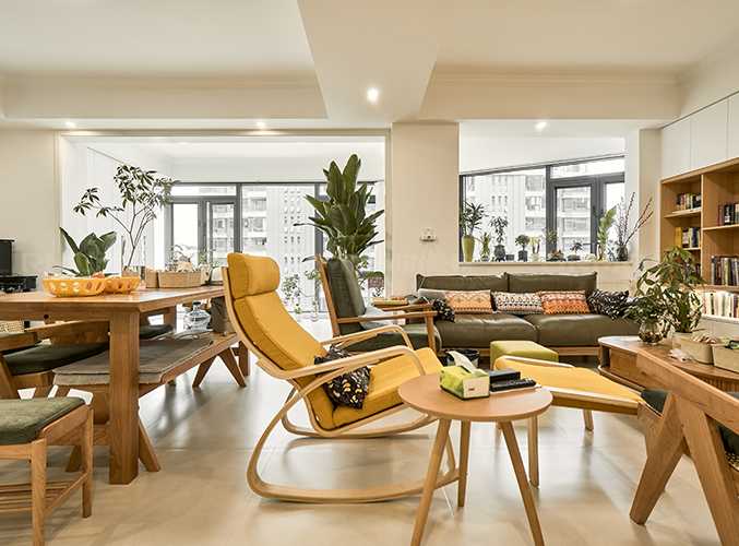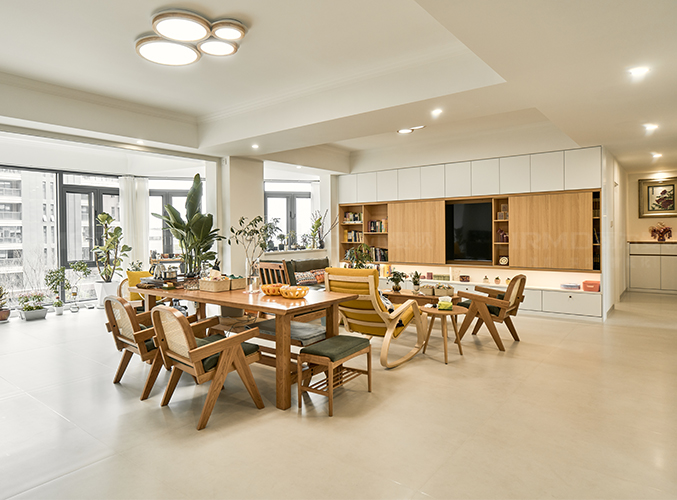 整屋大白墻,柔光瓷磚通鋪,空間大,采光好,可以放置各種綠植,電視背景墻設計幾盒壁龕放置