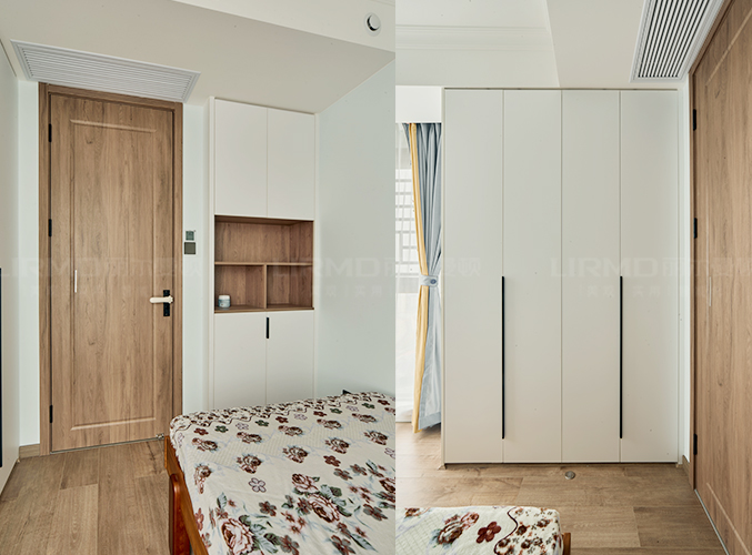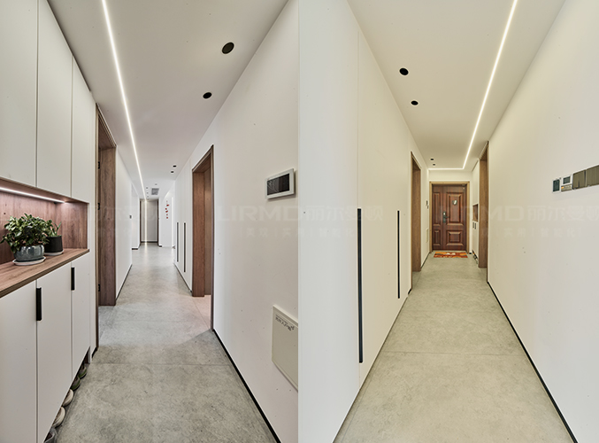 18mm厚杉木芯板,實木柜體搭配PET膚感柜門,長廊兩側分別置鞋柜和儲物柜,