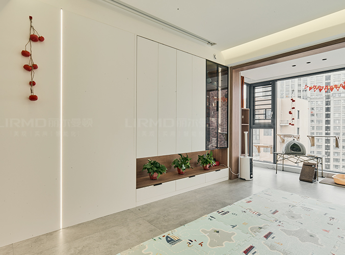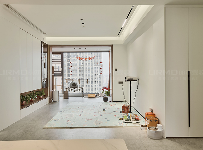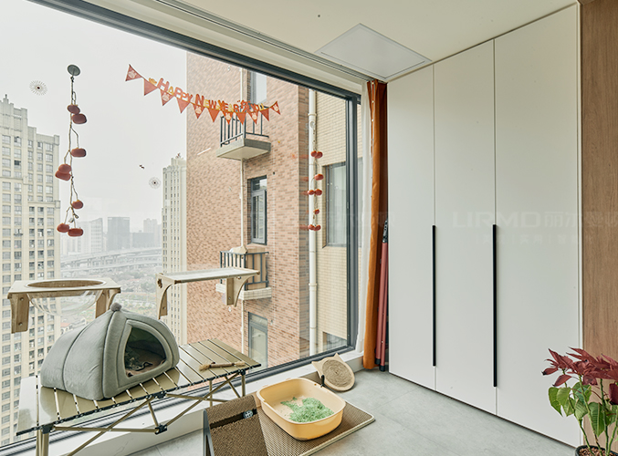陽臺接客廳通鋪啞光地磚,落地窗保證光照充足,與寵物共享美好時光。