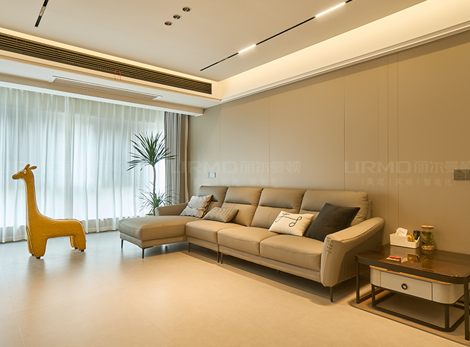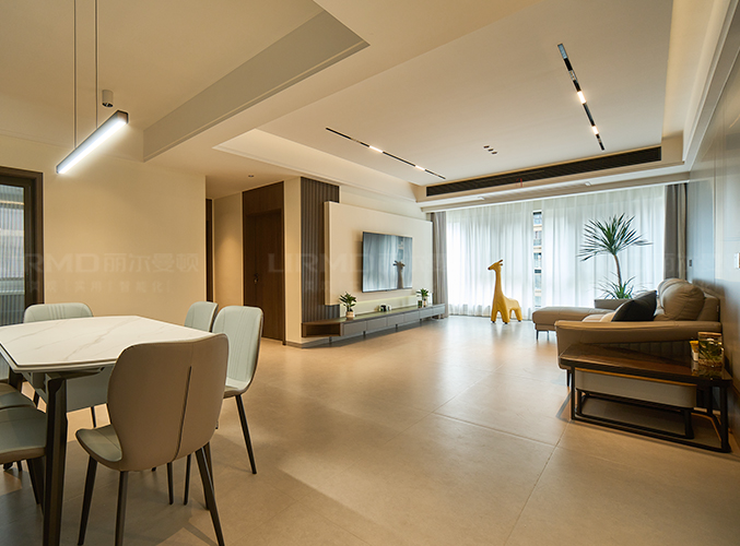 整墻做電視背景懸浮柜,整體灰色系基調搭配無主燈設計,線性燈帶營造滿滿高級感。