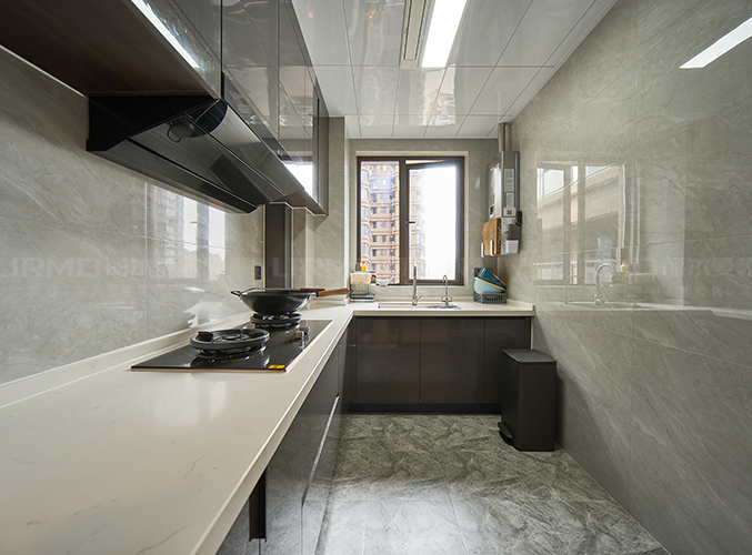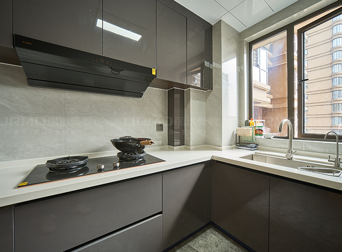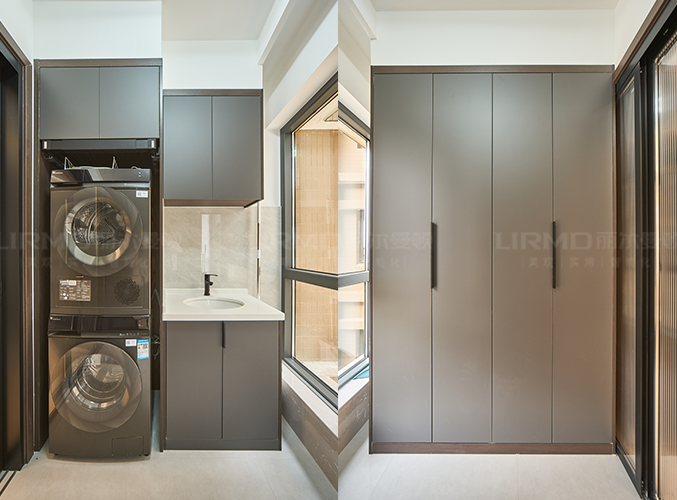 陽臺洗烘干一體化組合柜,深灰膚感飾面柜門質感十足。