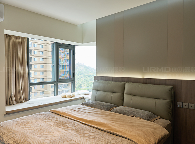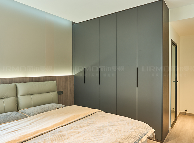 主臥延續低飽和度色系+深灰色一柜到頂衣柜,床頭裝木紋板搭配暖色氛圍燈烘托安靜柔和的氛圍,