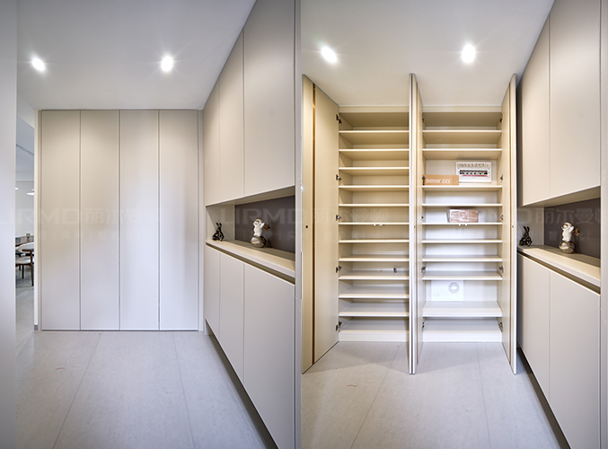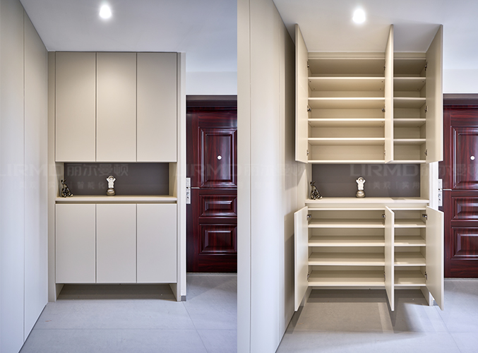 膚感鞋柜+一門(mén)到頂無(wú)拉手設(shè)計(jì),柜墻一體化盡顯極簡(jiǎn)之美。