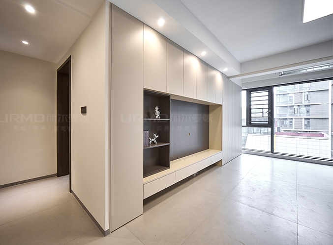 整屋通鋪瓷磚,盡顯大氣,電視背景墻采用整面墻做柜子設(shè)計(jì),超大收納空間儲(chǔ)物更方便,
