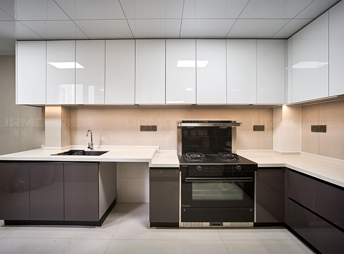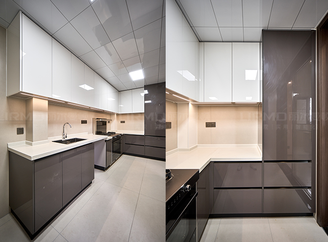 L型櫥柜超晶飾面美觀易打理,吊柜下內(nèi)嵌燈帶照亮主燈死角,烹飪更舒心。