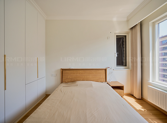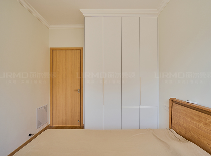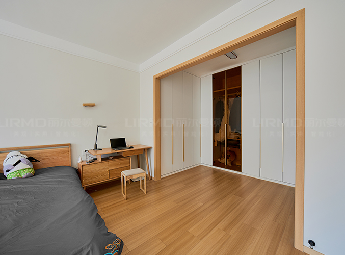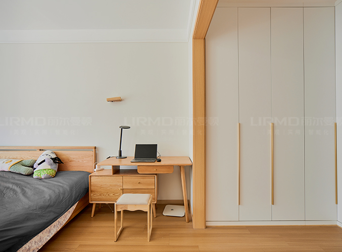 臥室整體原木+奶白,實木柜體搭配PET膚感柜門,一門到頂,質(zhì)感超不錯,