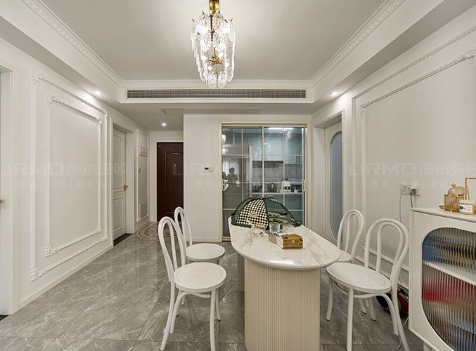 餐廳比鄰廚房,餐桌椅選奶白色及線條圓潤柔和的造型,與周圍法式風格相呼應。