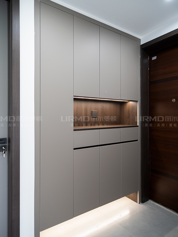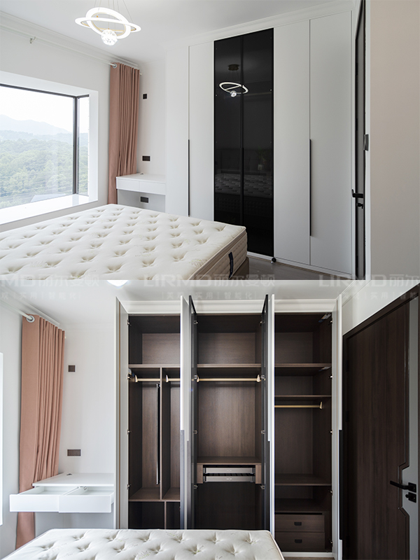 柜體采用足18厚杉木芯板,柜門采用LSB板PET膚感柜門,一門到頂,五金使用原裝進口的百隆五金