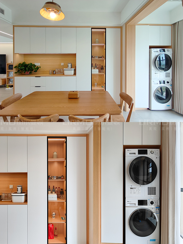 柜體板材是十環認證萬象天冠足18厚杉木實芯板,五金是奧地利進口百隆五金、徹底實現門墻柜一體化;
