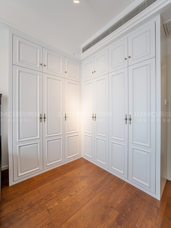 主臥帶L型獨(dú)立衣帽間,柜體柜門同色系配上銅色拉手點(diǎn)綴