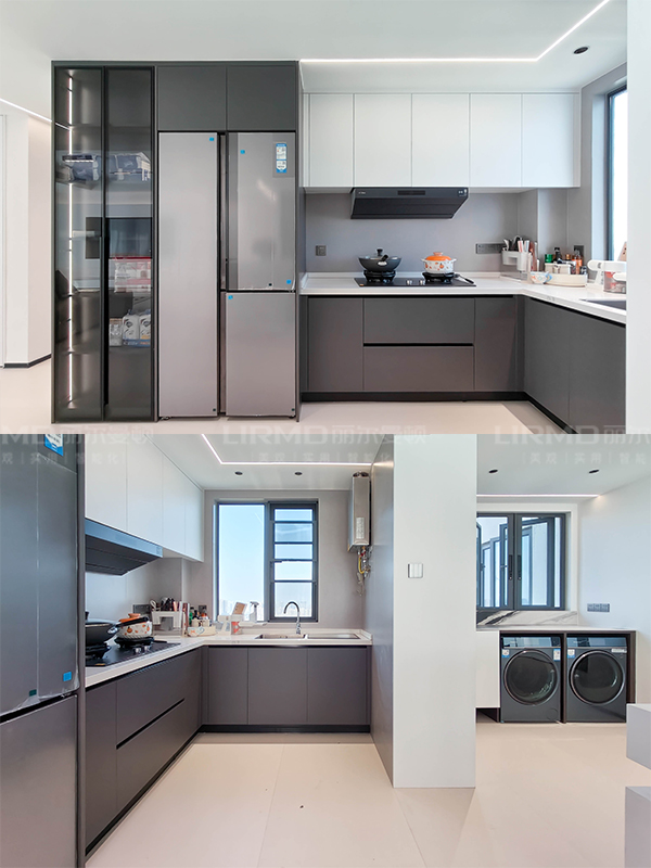 北面陽臺直接納入客廳區(qū)域,與廚房磚墻處理做轉角落地柜,增強收納空間。
