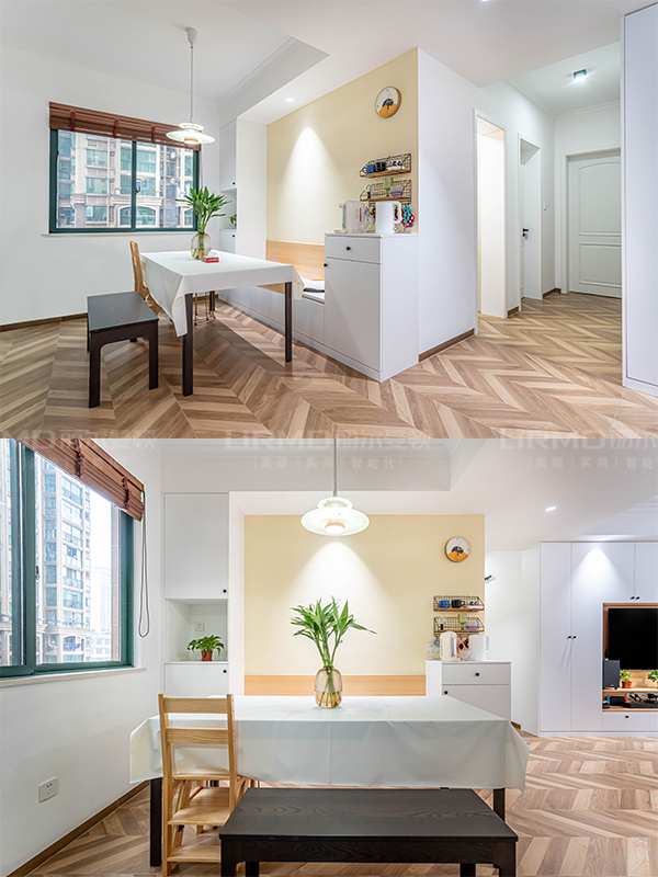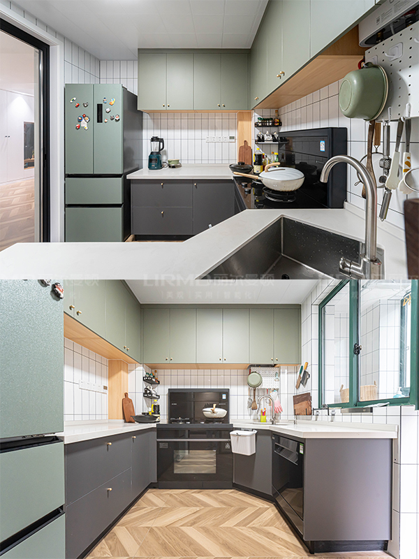 全屋共做了7組柜子,加上配套櫥柜,再搭配家具、電器。一體化卡座式餐廳、U型櫥柜、