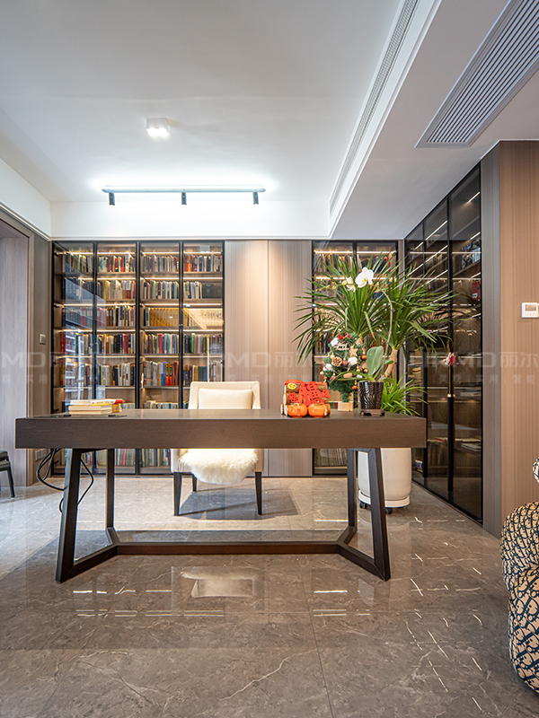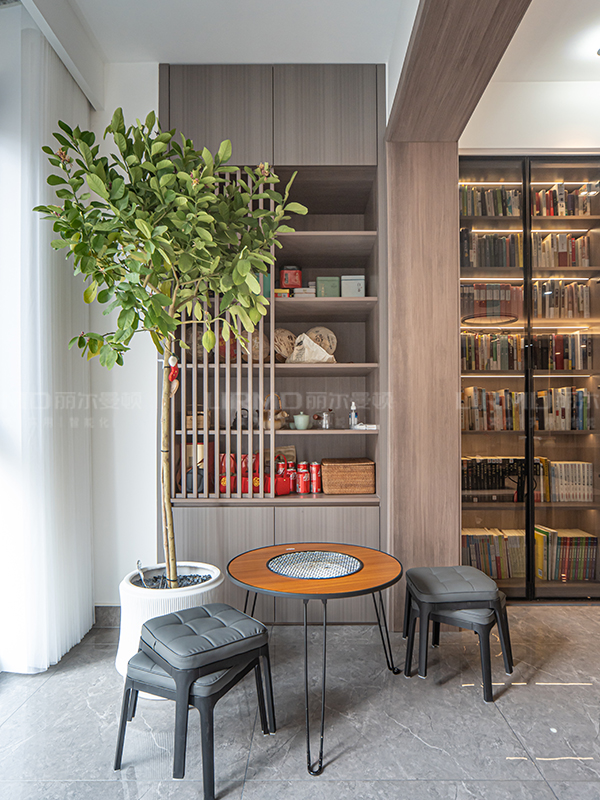 房客廳一體設(shè)計,空間通透明亮又舒適,整墻書柜滿滿的書香氣,辦公學(xué)習(xí)都毫無壓力