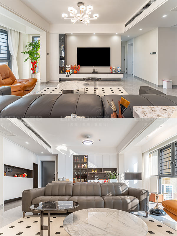 全屋1500×750柔光瓷磚,整體通透大氣,清潔方便,一字柜搭配玻璃柜,更得輕盈通透,滿滿的高級感