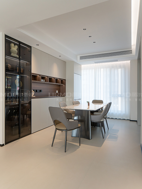 弧形設計,使電視背景墻左右側平緩過渡,內部安裝氛圍燈,烘托出家的暖意