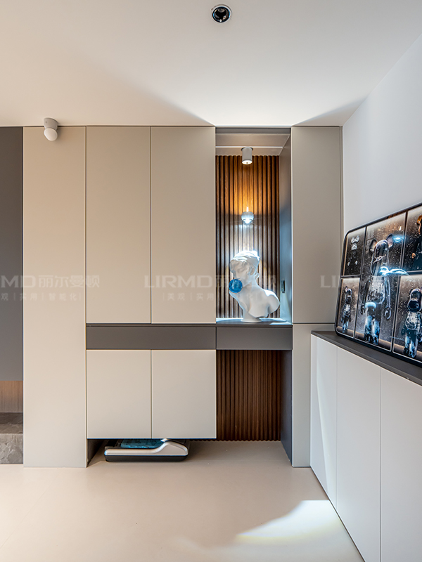入戶(hù)鞋柜采用懸浮穿插設(shè)計(jì),更具設(shè)計(jì)感,搭配飾品使空間更生動(dòng)