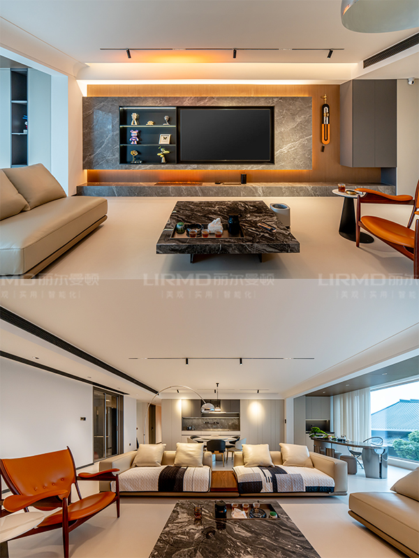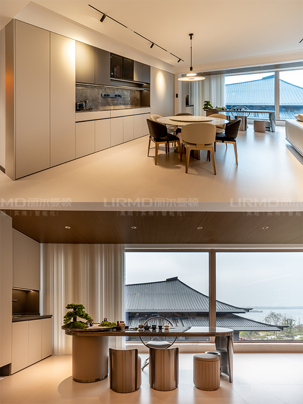 客餐廳空間開(kāi)闊大氣,木飾面巖板背景墻搭配無(wú)拉手柜門(mén)又美觀又實(shí)用