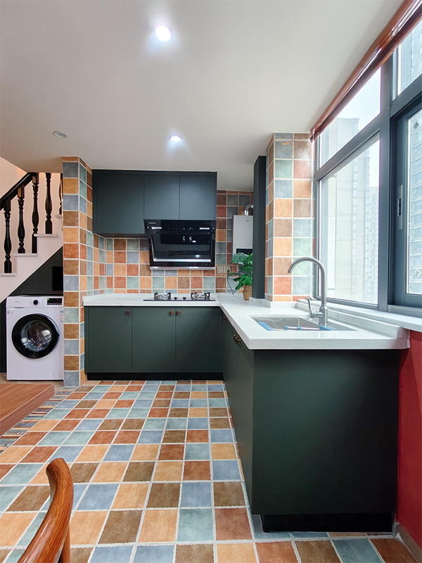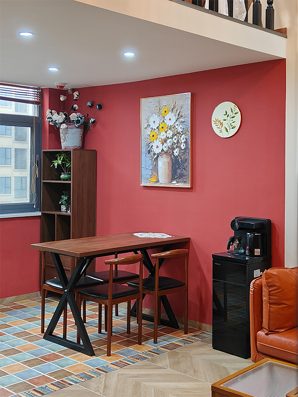 撞色搭配帶來的設計感,精致又復古,木質(zhì)柜與綠植等元素構(gòu)成主要特色