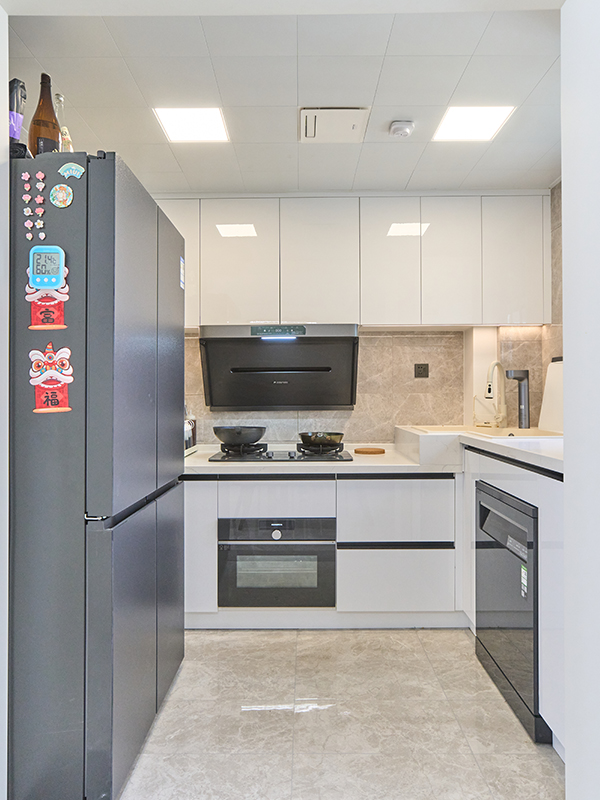 L 型櫥柜充分利用轉角空間,整體靈活多變,合理的動線設計讓業主在烹飪時事半功倍