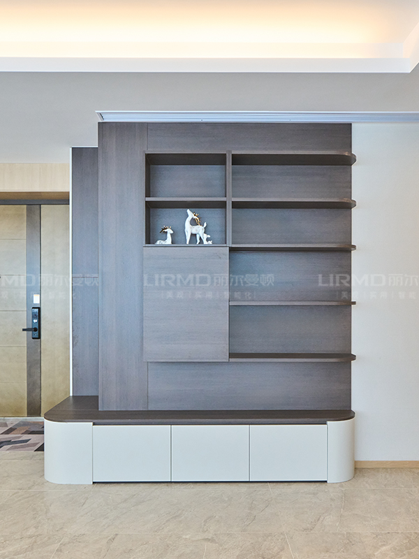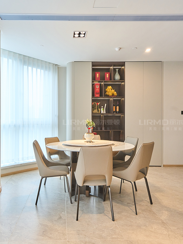 從視覺上更加符合居住環境,特意打造整墻餐邊柜,收納展示柜,轉墻多功能一體柜