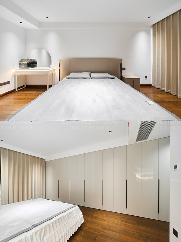 陽臺(tái)通鋪客廳空間非常大,全房做了無主燈吊頂,燈光柔和又充滿氛圍感