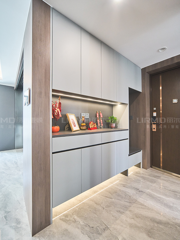 全房做了隱形門結合護墻板,電視背景做了巖板設計,電視內嵌,條柜做灰色調色搭配木紋色,輕奢感滿滿