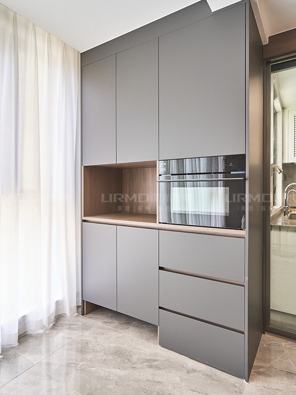 整個客餐廳以及陽臺等公共區域全部做了免拉手設計,利用免拉手的線條分割柜門,簡單又不失細節,非常顯高級感