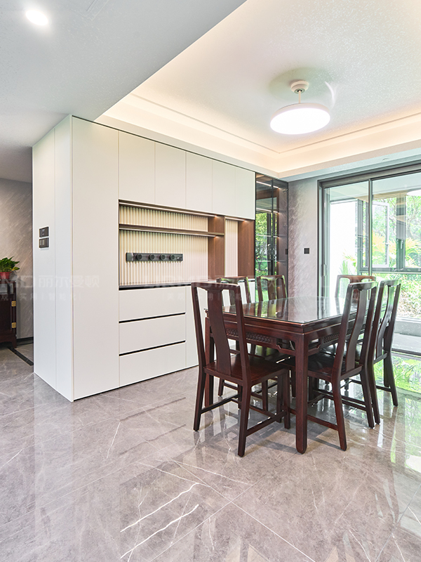餐邊柜采用多功能分區(qū)設(shè)計,開放區(qū)、大抽屜以及收納柜,充分滿足不同物品的收納需求