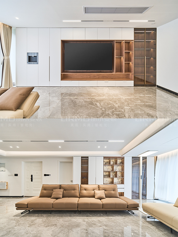 沙發背景和電視背景互相呼應,做同色設計,格柵+巖板進行局部點綴,增添亮點