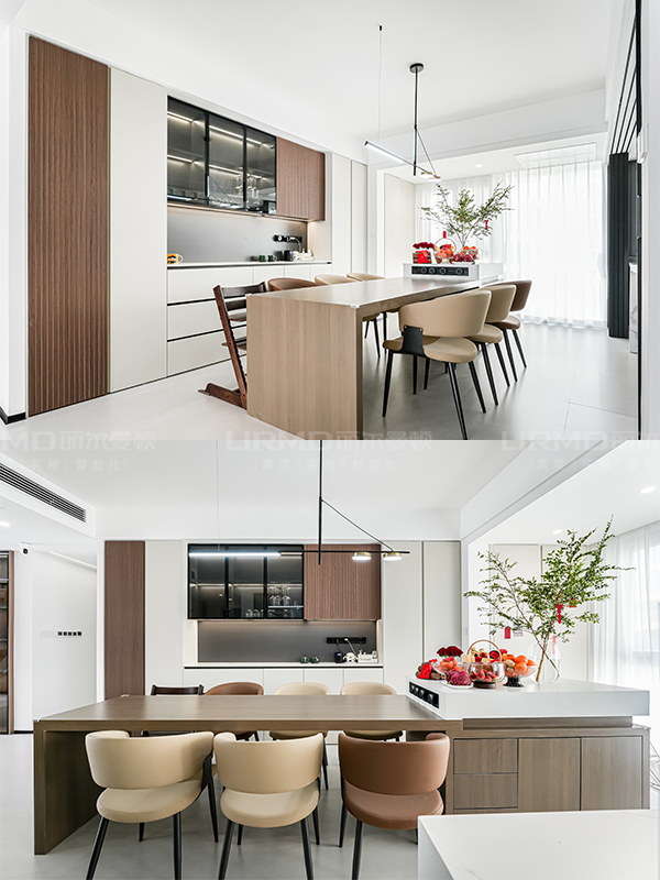 通過吊軌四聯動玻璃門打造靈活多變的廚房空間,動線流暢,家人之間也能更多互動。