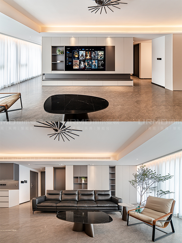 整個電視柜采用滿墻電視背景墻,讓原本開闊的橫廳增加了更多的儲物空間,整體效果簡約而不失設計感。