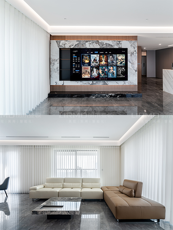 電視背景墻懸浮式巖板設計,灰色和棕色硬裝飾面結合作為輕奢基調