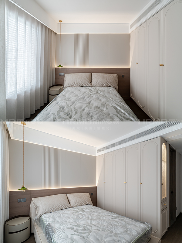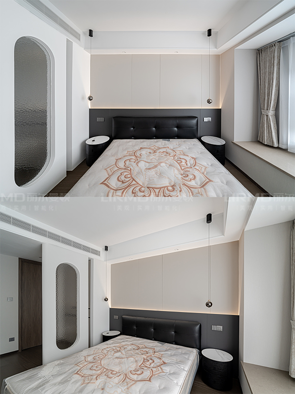 主臥床對衛生間的門做了隔斷設計,背景墻+燈光,輕奢氛圍感直接拉滿